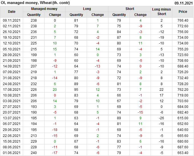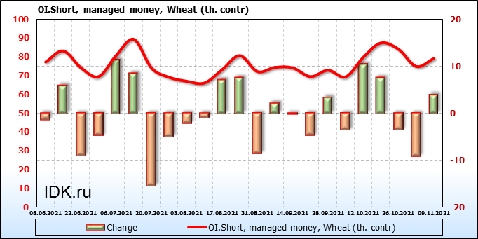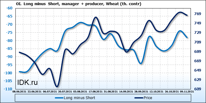 За прошлую неделю, 03.11.21 — 09.11.21, разница между длинными и короткими позициями управляющих сократилась на 2.9 тыс. контрактов. В тоже время, цена упала на 6.2 цента.