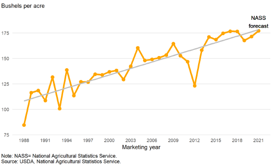 Рисунок 1. Урожайность кукурузы в США с 1988 по 2021 гг.