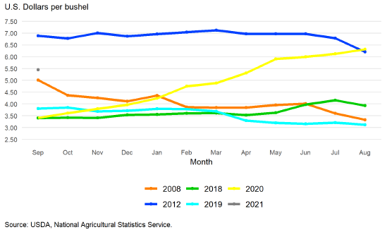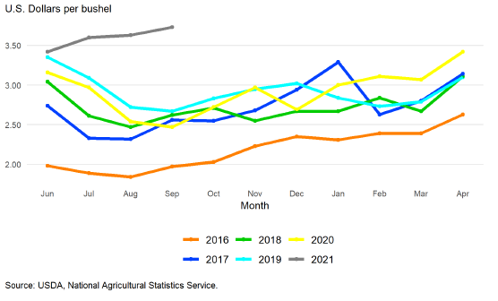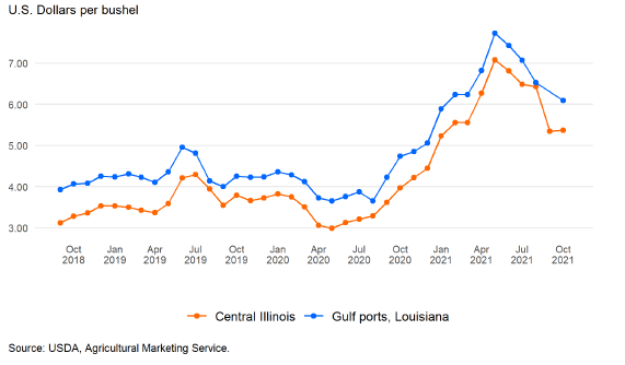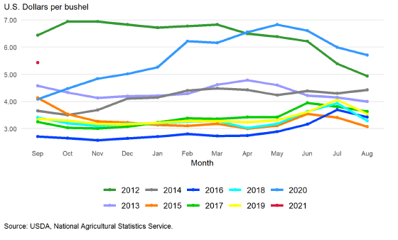Средняя сезонная цена на кукурузу на ферме прогнозируется на уровне 5,45 доллара за бушель на 2021/22 год, без изменений по сравнению с октябрем. Текущий прогноз будет значительным увеличением по сравнению со средней ценой на ферме в 2020/21 году, составлявшей 4,52 доллара за бушель. В своем последнем отчете о сельскохозяйственных ценах, опубликованном 29 октября, NASS сообщило, что в среднем по стране цена на кукурузу в сентябре, полученная фермерами, составила 5,45 доллара за бушель. Данные за сентябрь представляют собой отчет за первый месяц 2021/22 маркетингового года; хотя октябрь, ноябрь и январь исторически имеют наибольший вес в средней сезонной цене, когда производители продают большую часть своей кукурузы. Сентябрьская цена является первым индикатором того, как форвардные контракты в течение сезона повлияют на выручку производителей кукурузы.