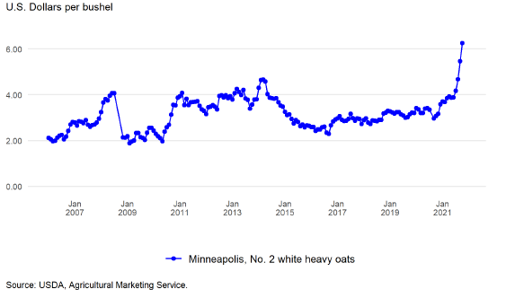 Снижение производства и запасов овса в значительной степени обусловлено сокращением потребления овса на рынках кормов для животных. При минимальных объемах экспорта рынок овса неуклонно трансформируется из рынка, ориентированного на животноводство, в рынок, ориентированный на продовольственное потребление. Учитывая внезапное сокращение прогноза доступных запасов овса в 2021/22 году, спрос на рынке, вероятно, является менее эластичным по цене, а продажи овса в большей степени зависят от договорных соглашений с производителями, чем это было 10 и 20 лет назад. В результате, когда засушливые условия на севере США и в прериях Канады существенно снизили производство в Северной Америке, цены на овес в США начали существенно расти.