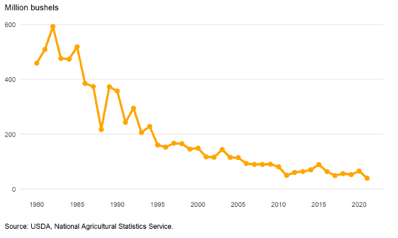 Рисунок 12. Производство овса в США с 1980 по 2021 гг.