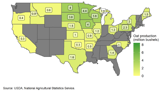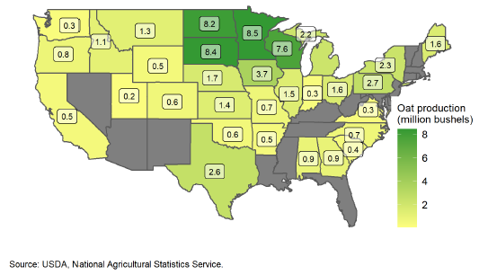 Производство овса в США неуклонно снижается с 1980-х годов. В течение 1980/81 и 1985/86 годов в Соединенных Штатах было произведено от 450 до 600 миллионов бушелей. За последние 10 лет наибольший урожай овса составил чуть менее 90 миллионов бушелей. Это снижение в первую очередь было результатом сокращения посевов овса на зерно, при этом урожайность неуклонно растет.