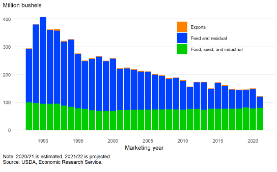 Кормовое и остаточное потребление для всех фуражных зерновых и пшеницы прогнозируется на уровне 150,4 миллиона метрических тонн по сравнению с оценкой для 2020/21 года в 149,3 миллиона тонн. Дополнительное кормовое и остаточное потребление кукурузы, сорго и ячменя, как ожидается, более чем компенсирует сокращение для пшеницы и овса.