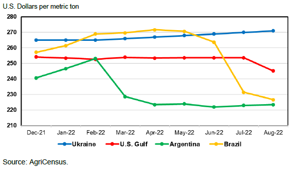 Наличные цены на кукурузу упали с высоких уровней, наблюдавшихся в летние месяцы. Это снижение было ожидаемым, учитывая влияние выхода продукции 2021/22 года на рынок, при том, что конечные остатки упали до очень низкого уровня к концу лета в Соединенных Штатах. Несмотря на то, что цены снизились с лета, они остаются выше, чем в прошлом году, это означает, что на рынке сохраняется устойчивый спрос. Цена на кукурузу на наличном рынке в Центральном Иллинойсе в октябре составила в среднем 5,37 доллара за бушель по сравнению с 3,97 доллара в октябре 2020 года и недавним пиком в 7,08 доллара в мае 2021 года. Наличные цены на экспортных рынках демонстрируют аналогичную картину: средняя цена в Мексиканском заливе в октябре составила 6,09 доллара за бушель по сравнению с 4,74 доллара в октябре 2020 года.