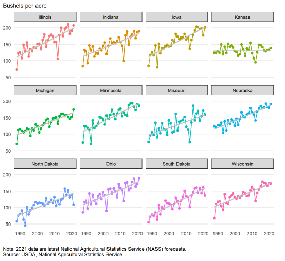 Рисунок 2. Урожайность кукурузы в США по штатам, с 1988 по 2021 гг.