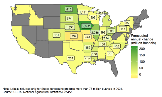 Рисунок 3. Прогноз производства кукурузы в США в 2021 году и изменение год к году, млн бушелей.