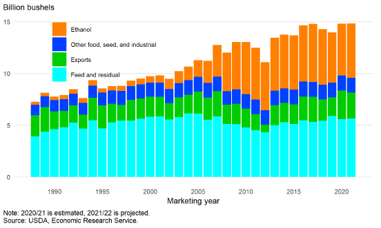 Согласно прогнозу, общее потребление кукурузы в 2021/22 году составит 14 830 миллионов бушелей, что на 50 миллионов бушелей больше, чем ожидалось в октябрьском отчете. Прогноз общего потребления год к году лишь немного повышен. Однако, согласно прогнозу, в 2021/22 году на внутреннее потребление придется более крупная его доля, по сравнению с предыдущим годом, когда был зафиксирован рекордный экспорт.