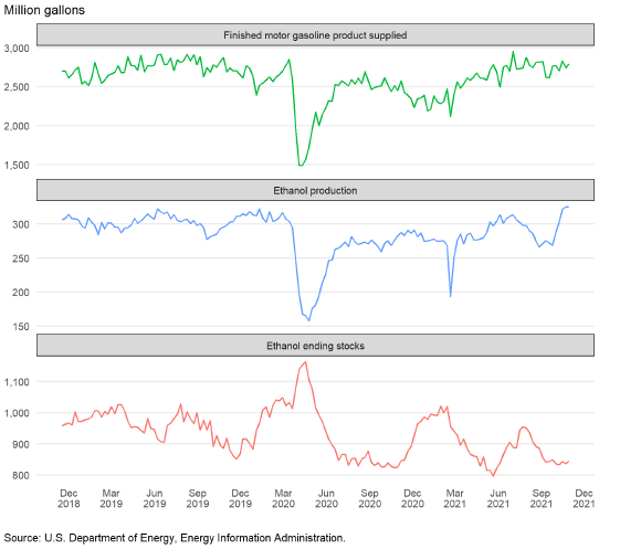 Согласно еженедельным данным Управления энергетической информации (EIA) Министерства энергетики, производство этанола существенно увеличилось в октябре. Еженедельные объемы в октябре почти превысили рекордные показатели, достигнутые в 2017 году. Это увеличение частично связано с высокой маржой производителей этанола, поскольку цены на кукурузу упали с выходом урожая кукурузы 2021/22 года на рынок, а цены на топливо оставались высокими.
