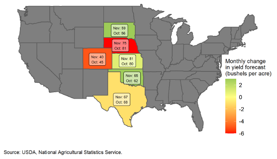 Согласно ноябрьскому отчету NASS, прогноз урожайности сорго в основных штатах-производителях сорго был пересмотрен по сравнению с октябрьским отчетом. Урожайность в Колорадо, Небраске и Техасе была снижена на 5, 4 и 1 бушель с акра соответственно. Снижение прогнозируемой урожайности в Колорадо, Небраске и Техасе компенсируется увеличением на 3, 1 и 3 бушеля на акр в Оклахоме, Канзасе и Южной Дакоте, соответственно. В результате урожайность в целом по стране остается неизменной.
