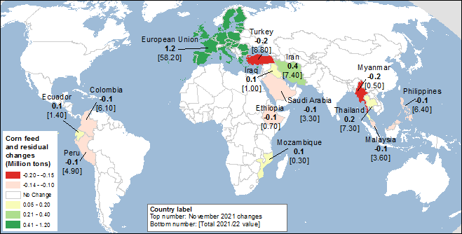 Карта 1. Изменения кормового и остаточного потребления кукурузы (млн. тонн) для 2021/22 года, ноябрь 2021.