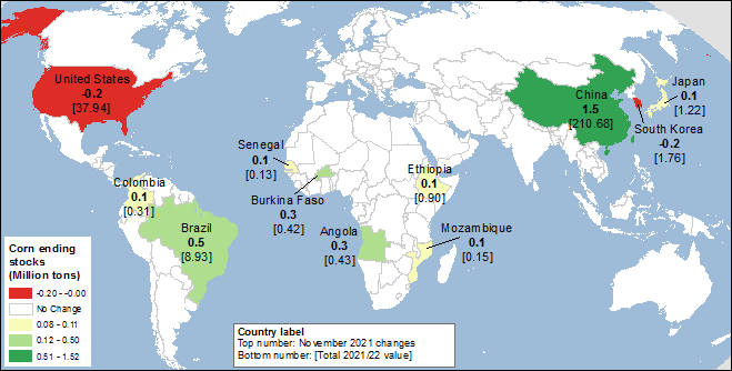 Поскольку увеличение прогнозируемого потребления превышает рост прогноза производства, прогнозируемые конечные остатки кукурузы на 2021/22 год составляют 1 493 млн бушелей, что на 7 млн бушелей меньше, чем в октябрьском отчете.