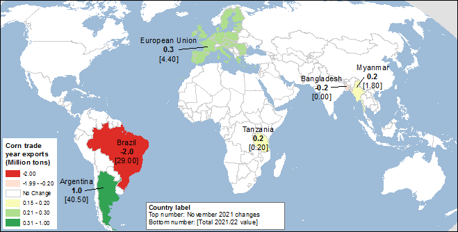 Экспорт кукурузы из Аргентины повышен как благодаря увеличению запасов, так и росту конкурентоспособности, чему способствовали более крупные поставки по конец октября. Прогноз бразильского экспорта снижен из-за низких поставок в октябре. Прогнозы импорта фуражного зерна в Китай продолжают расти, и ожидается, что увеличение китайского импорта ячменя и сорго поможет удовлетворить кормовой спрос. Прогноз экспорта кукурузы из США не изменился и составляет около 33 процентов от мировой торговли кукурузой, что на 5,6 миллиона тонн меньше, чем в предыдущем году, поскольку все основные конкуренты США по экспорту кукурузы имеют потенциал (при нормальных погодных условиях) для высоких урожаев и больших объемов экспорта в том же году.