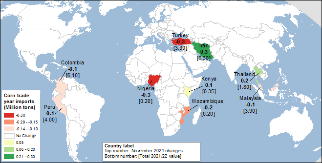 Карта 4. Основные изменения импорта кукурузы для 2021/22 торгового года (млн. тонн), ноябрь 2021.