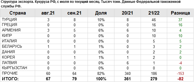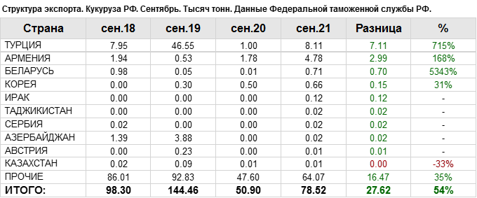 За январь-октябрь 2021 года (данные по ЕАЭС за январь-август) Россия поставила на внешние рынки 3,2 млн тонн кукурузы, что на 6,8% больше аналогичного периода 2020 года. В стоимостном выражении экспорт увеличился на 42% до 759 млн долл. В 2009 году Россия превратилась из нетто-импортера в нетто-экспортера кукурузы, и в настоящее время, по данным ITC Trade Map, входит в топ-10 мировых поставщиков данной культуры. Отгрузки кукурузы активизировались во второй половине прошлого сезона (январь-июнь 2021), когда экспортеры стали переключаться с пшеницы на другие зерновые культуры, в том числе кукурузу.