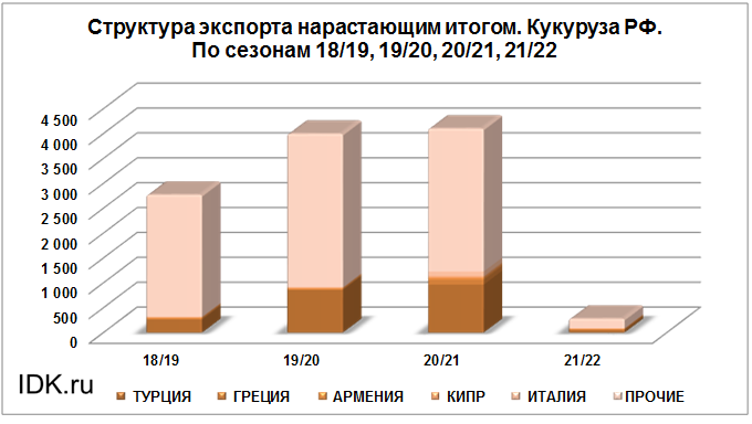 Структура экспорта кукурузы из России нарастающим итогом по сезонам