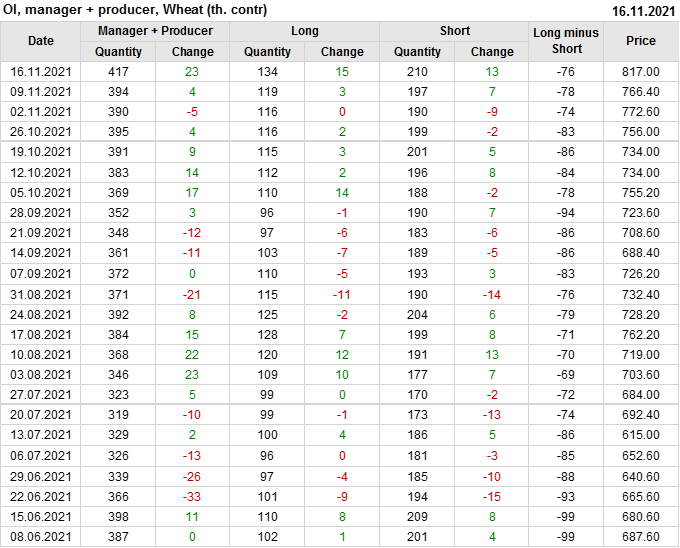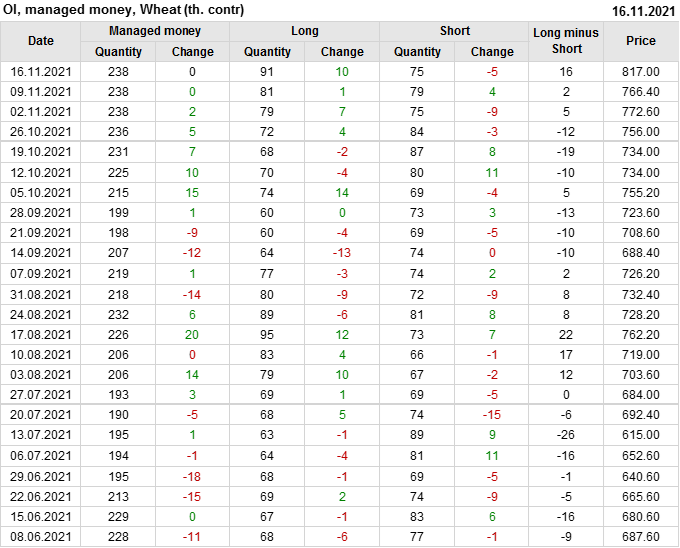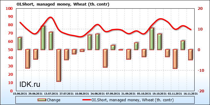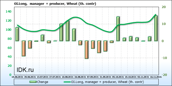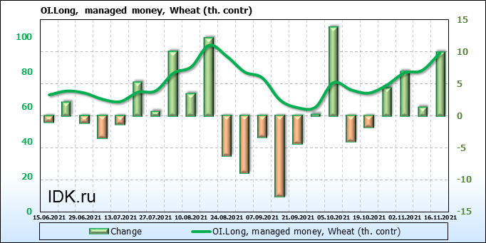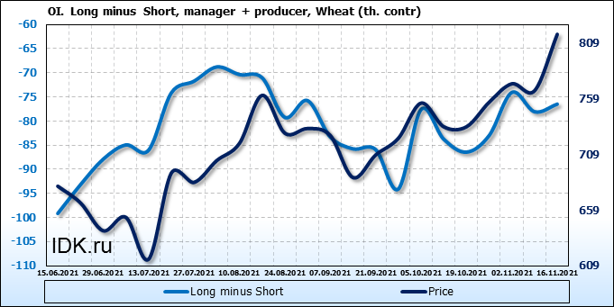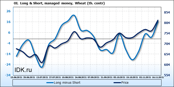 За прошлую неделю, 10.11.21 — 16.11.21, разница между длинными и короткими позициями управляющих увеличилась на 14.5 тыс. контрактов. В тоже время, цена выросла на 50.6 цента.