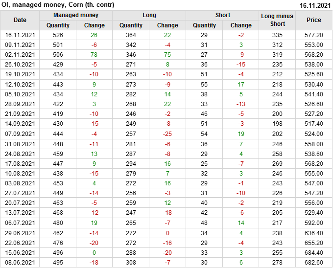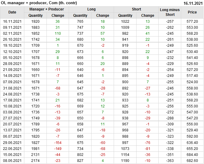 За прошлую неделю, 10.11.21 — 16.11.21, разница между длинными и короткими позициями управляющих увеличилась на 23.6 тыс. контрактов. В тоже время, цена выросла на 24.2 цента.