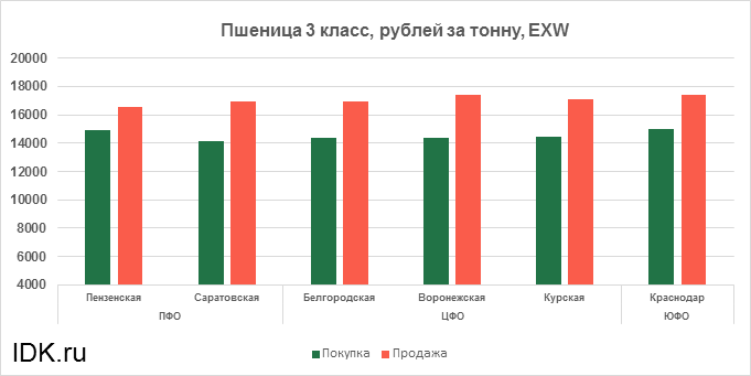 За прошедшую неделю с 15.11.2021 по 19.11.2021 средняя цена на пшеницу 3-го класса, согласно выставленным заявкам трейдеров, упала по всем округам на 158 рублей. Средняя цена составляет 15942 рубля за тонну.
