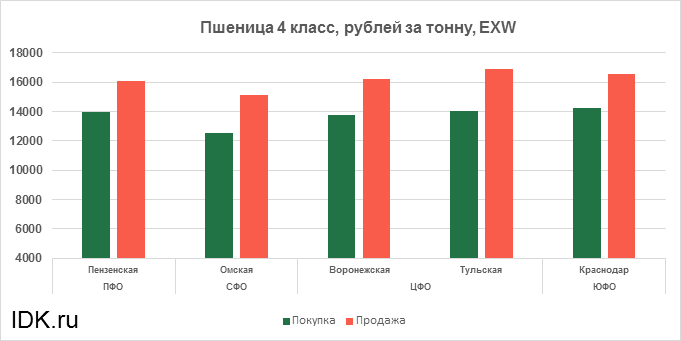 За прошедшую неделю с 15.11.2021 по 19.11.2021 средняя цена на пшеницу 4-го класса, согласно выставленным заявкам трейдеров, выросла по всем округам на 3 рубля. Средняя цена составляет 14904 рубля за тонну.