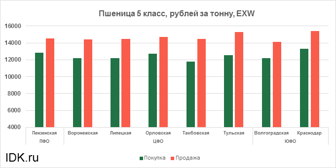 За прошедшую неделю с 15.11.2021 по 19.11.2021 средняя цена на пшеницу 5-го класса, согласно выставленным заявкам трейдеров, выросла по всем округам на 503 рубля. Средняя цена составляет 13490 рублей за тонну.