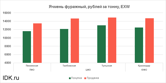 За прошедшую неделю с 15.11.2021 по 19.11.2021 средняя цена на фуражный ячмень, согласно выставленным заявкам трейдеров, упала по всем округам на 552 рубля. Средняя цена составляет 13137 рублей за тонну.