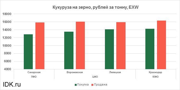 За прошедшую неделю с 15.11.2021 по 19.11.2021 средняя цена кукурузы на зерно, согласно выставленным заявкам трейдеров, упала по всем округам на 361 рубль. Средняя цена составляет 14888 рублей за тонну.
