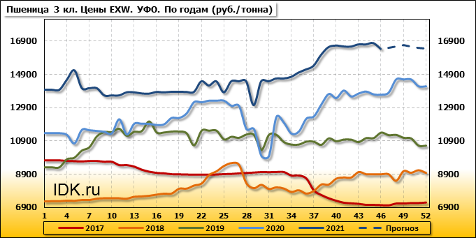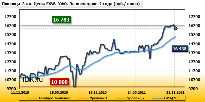 Внутренние цены на пшеницу 3 класса в Уральском федеральном округе упали на 345 руб./т. и на данный момент составляют 16438 рублей за тонну.