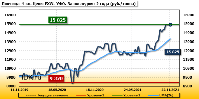 Цены на пшеницу 4-го класса не изменились и составляют 15825 рублей за тонну.