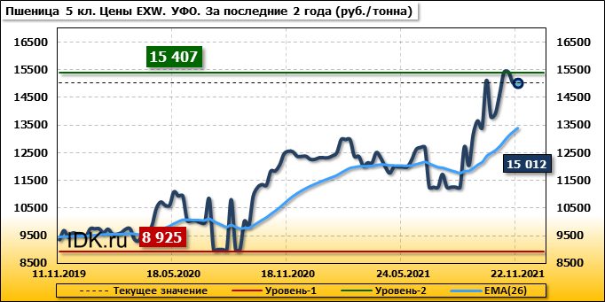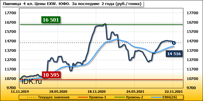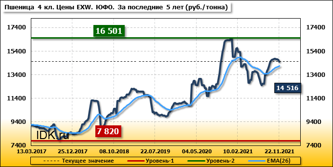 Цены на пшеницу 4-го класса снизились на 169 руб./т. и на данный момент составляют 14516 рублей за тонну.