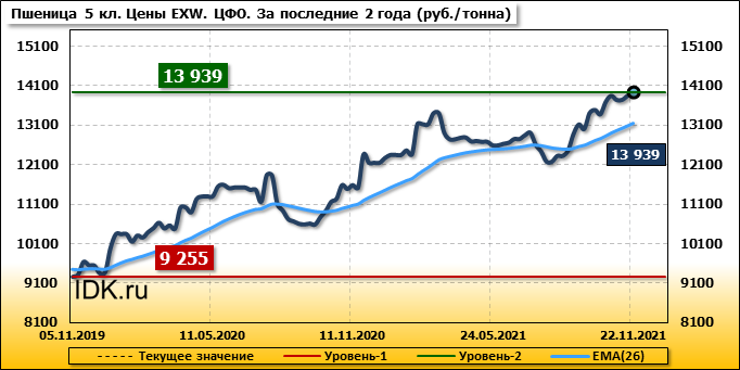 Цены на пшеницу 5-го класса повысились на 91 руб./т. и на данный момент составляют 13939 рублей за тонну.