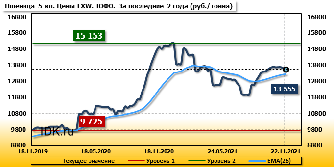 Цены на пшеницу 5-го класса понизились на 54 руб./т. и на данный момент составляют 13555 рублей за тонну.