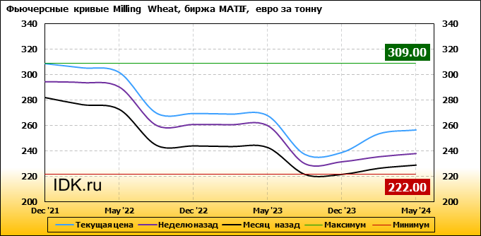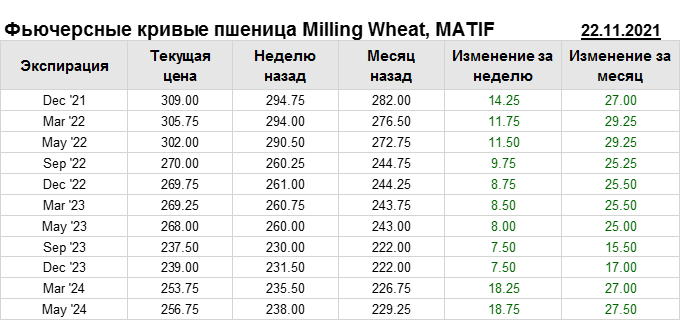 На 22.11.2021 стоимость пшеницы Milling Wheat на бирже MATIF по контракту Dec ’21 составила 309 евро за тонну. За прошедшую неделю стоимость пшеницы Milling Wheat выросла на 14.25 евро/тонна. Как мы видим на графике, фьючерсная кривая имеет периоды, когда более дальний фьючерс дешевле ближнего. Состояние бэквардации наблюдаем на следующих контрактах: Mar ’22; May ’22; Sep ’22; Dec ’22; Mar ’23; May ’23; Sep ’23. Таким образом, трейдеры предполагают, что возможно превалирование предложения над спросом в указанные периоды.
