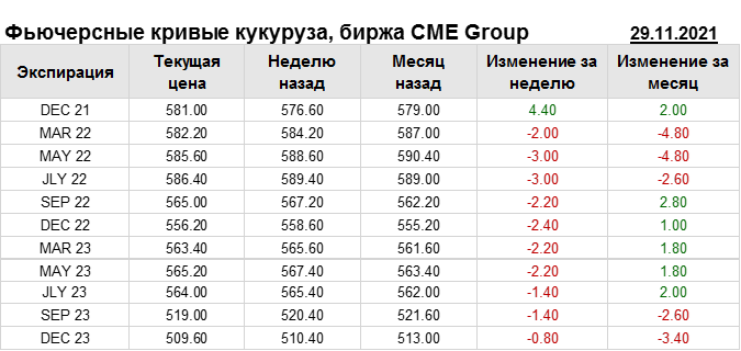На 29.11.2021 стоимость кукурузы на бирже CME Group по контракту DEC 21 составила 581 цент за бушель. За прошедшую неделю стоимость кукурузы на площадке CME Group выросла на 4.4 цента/бушель. Как мы видим на графике, фьючерсная кривая имеет периоды, когда более дальний фьючерс дешевле ближнего. Состояние бэквардации наблюдаем на следующих контрактах: SEP 22; DEC 22; JLY 23; SEP 23; DEC 23. Таким образом, трейдеры предполагают, что возможно превалирование предложения над спросом в указанные периоды.