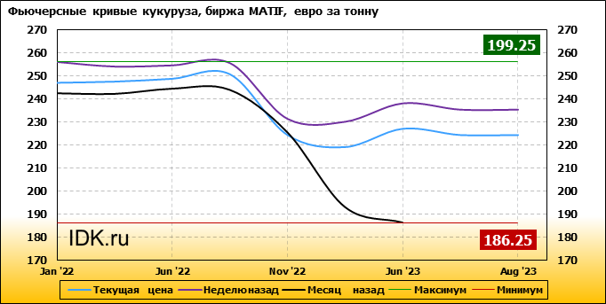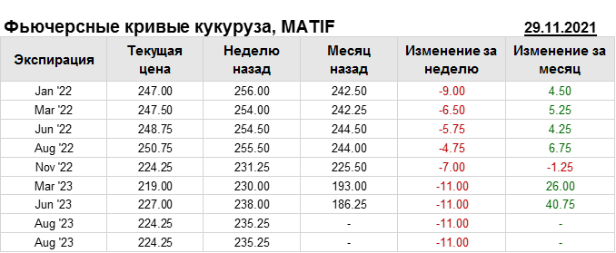 На 29.11.2021 стоимость кукурузы на бирже MATIF по контракту Jan ’22 составила 247 евро за тонну. За прошедшую неделю стоимость кукурузы на европейской площадке упала на 9 евро/тонна. Как мы видим на графике, фьючерсная кривая имеет периоды, когда более дальний фьючерс дешевле ближнего. Состояние бэквардации наблюдаем на следующих контрактах: Nov ’22; Mar ’23; Aug ’23. Таким образом, трейдеры предполагают, что возможно превалирование предложения над спросом в указанные периоды.