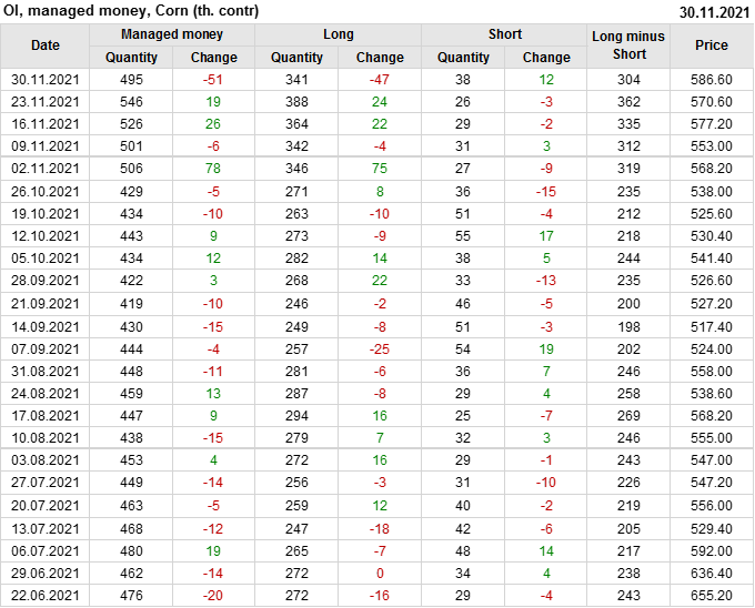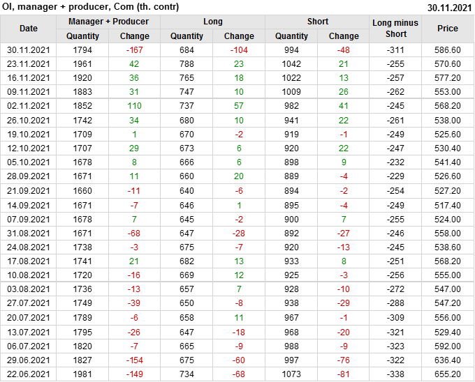 За прошлую неделю, 24.11.21 — 30.11.21, разница между длинными и короткими позициями управляющих сократилась на 58.5 тыс. контрактов. В тоже время, цена выросла на 16 центов.