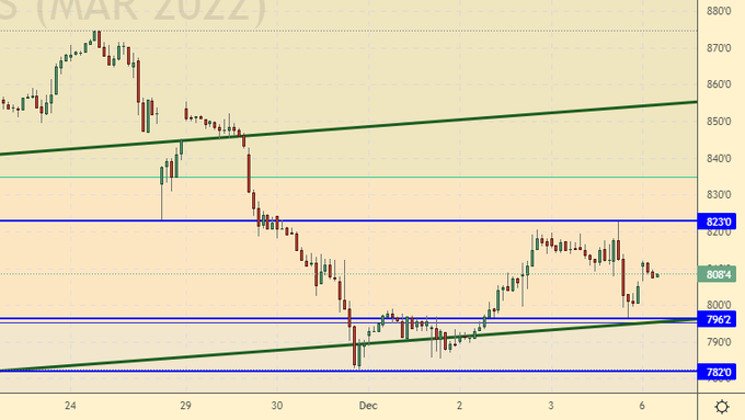 Пшеница старается удержаться выше 800.0. Если сегодня мы снова свалимся ниже 790.0, то атака быков захлебнется и нам придется рассуждать о возможной коррекции к уровню 700.0, а возможно и ниже. Пока этого не произошло, продолжаем размышлять об уровне 900.0. Скорее всего никаких фундаментальных потрясений у нас больше не будет вплоть до весны. Следующие несколько недель рынок будет находиться во власти технических факторов.