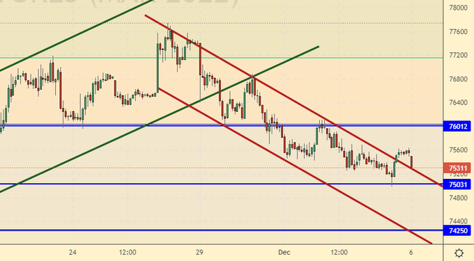 В случае падения рынка ниже уровня 72.70 возникнет угроза разворота тренда вниз. Доллару на данный момент нечего предложить кроме инфляции в 7%. А у рубля есть шанс, так как, в случае если инфляция в России в 2022-м году действительно начнет снижаться, то ставка в 8.5% от ЦБ РФ о которой мы можем уже смело говорить, затащит на рынок даже тех, кто рубль не переваривал по личным или политическим причинам. Потому что жадность.
