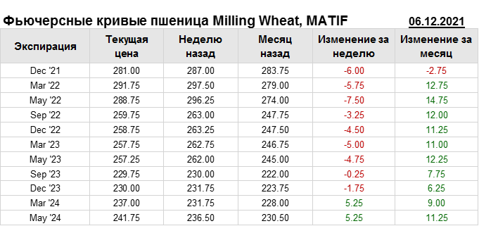 На 06.12.2021 стоимость пшеницы Milling Wheat на бирже MATIF по контракту Dec ’21 составила 281 евро за тонну. За прошедшую неделю стоимость пшеницы Milling Wheat упала на 6 евро/тонна. Как мы видим на графике, фьючерсная кривая имеет периоды, когда более дальний фьючерс дешевле ближнего. Состояние бэквардации наблюдаем на следующих контрактах: May ’22; Sep ’22; Dec ’22; Mar ’23; May ’23; Sep ’23. Таким образом, трейдеры предполагают, что возможно превалирование предложения над спросом в указанные периоды.