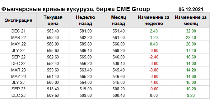 На 06.12.2021 стоимость кукурузы на бирже CME Group по контракту DEC 21 составила 583.4 цента за бушель. За прошедшую неделю стоимость кукурузы на площадке CME Group выросла на 2.4 цента/бушель. Как мы видим на графике, фьючерсная кривая имеет периоды, когда более дальний фьючерс дешевле ближнего. Состояние бэквардации наблюдаем на следующих контрактах: JLY 22; SEP 22; DEC 22; JLY 23; SEP 23; DEC 23. Таким образом, трейдеры предполагают, что возможно превалирование предложения над спросом в указанные периоды.