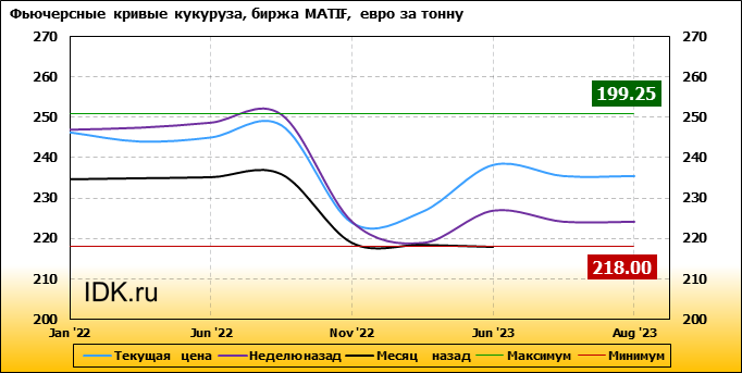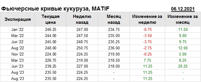 На 06.12.2021 стоимость кукурузы на бирже MATIF по контракту Jan ’22 составила 246.25 евро за тонну. За прошедшую неделю стоимость кукурузы на европейской площадке упала на 0.75 евро/тонна. Как мы видим на графике, фьючерсная кривая имеет периоды, когда более дальний фьючерс дешевле ближнего. Состояние бэквардации наблюдаем на следующих контрактах: Mar ’22; Nov ’22; Aug ’23 Таким образом, трейдеры предполагают, что возможно превалирование предложения над спросом в указанные периоды.