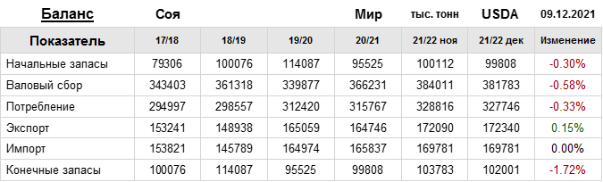 За прошедший месяц министерство сельского хозяйства США (USDA) на 09.12.2021 пересмотрело Баланс сои для Мира в сезоне 21/22 следующим образом: