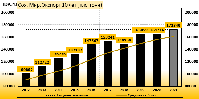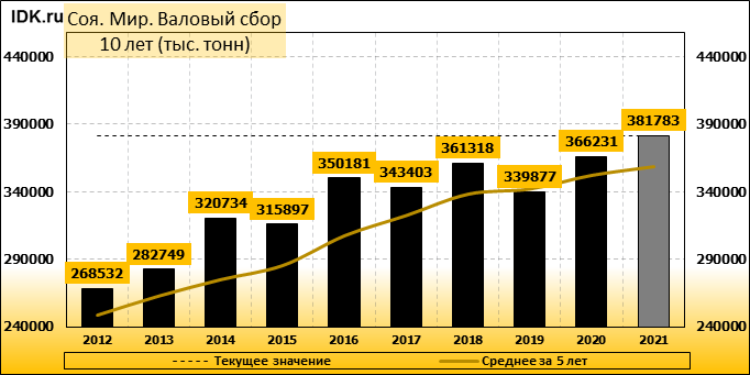 Мировое производство сои в 2021/22 году снижено на 2,23 млн тонн до 381,78 млн, поскольку снижение производства в Китае и Парагвае на 2,60 и 0,50 млн. тонн соответственно частично компенсируется увеличением производства в Канаде на 0,37 млн. тонн, Украине – на 0,3 млн. тонн и России – на 0,2 млн. тонн. Мировой экспорт сои в сезоне 2021/22 повышен со 172,1 до 172,3 млн. тонн. При этом прогноз экспорта сои повышен для Канады и Украины, благодаря повышению прогнозов производства, и снижен для Парагвая. Мировые остатки сои сокращены на 1,8 млн тонн до 102,0 млн.