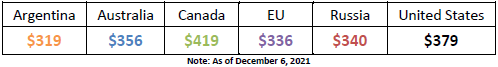Экспортные цены в США выросли с момента публикации ноябрьского отчета WASDE. Hard Red Spring (HRS) менялась в основном в узком диапазоне, отражая ограниченный спрос, на исключительно высоком уровне 441 долл. США за тонну, что почти на 60 процентов выше, чем в прошлом году. Аналогичным образом Soft White Winter (SWW) достигла пика в прошлом месяце, а затем вновь упала до 457 долларов за тонну из-за слабого внешнего спроса. Hard Red Winter (HRW) подорожала на 17 долларов за тонну до 379 долларов, а Soft Red Winter (SRW) — на 13 долларов за тонну до 348 долларов.