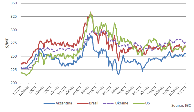 После публикации ноябрьского отчета WASDE цены основных экспортеров первоначально снизились из-за опасений по поводу распространения штамма COVID-19 омикрон; однако в начале декабря в Северной и Южной Америке цены выросли. Предложения в Аргентине выросли на 7 долларов за тонну до 255 долларов, а бразильские цены поднялись на 11 долларов за тонну до 270 долларов за счет хорошего экспортного спроса в конце сезона. Цены в США выросли на 8 долларов за тонну до 268 долларов, поскольку сохраняющийся внутренний спрос со стороны переработчиков и отчеты об экспортных продажах в размере 1,0 миллиона тонн за неделю, закончившуюся 25 ноября, оказали ценовую поддержку. Украинские предложения остались относительно неизменными, на уровне 278 долларов, что представляет собой снижение на 2 доллара за тонну.