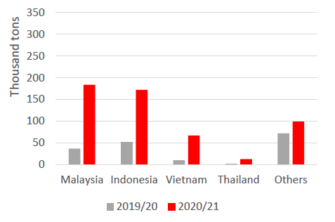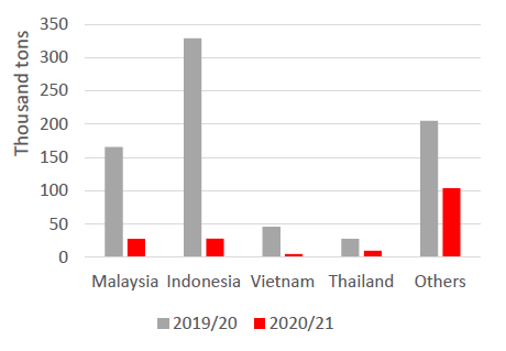 Изменения на мировом рынке для 2020/21 МГ (тыс. тонн) – основаны на торговых данных