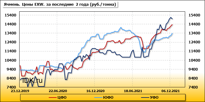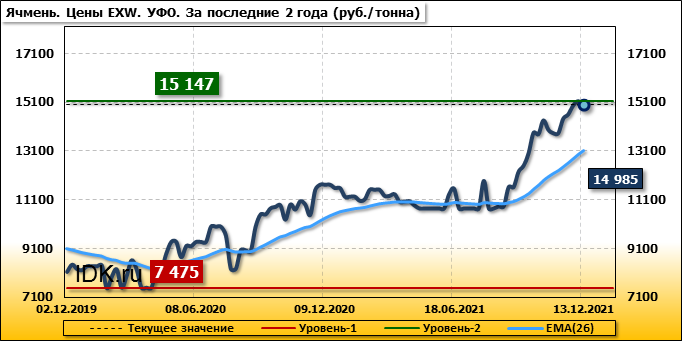 Внутренние цены на ячмень в Уральском федеральном округе упали на 162 руб./т. и на данный момент составляют 14985 рублей за тонну.