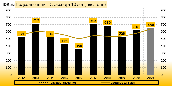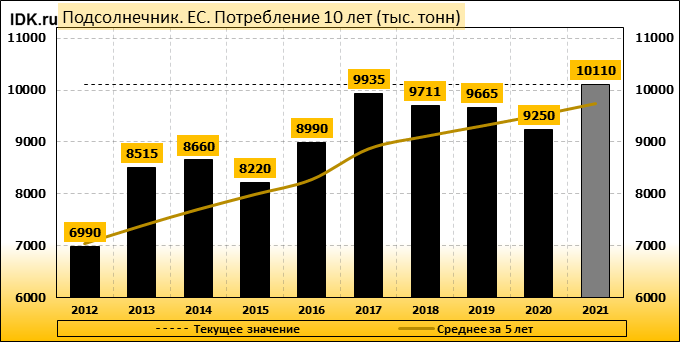 Министерство Сельского Хозяйства США оставило без изменений прогноз производства подсолнечника в ЕС в 2021/22 году – на уровне 10,15 млн тонн, что на 1,30 млн. тонн или 14,68 процентов превышает производство в предыдущем году. Урожайность подсолнечника в ЕС как и в прошлом месяце прогнозируется на уровне 2,31 т/га, а прогноз уборочной площади остается на уровне 4,39 млн га. Прогноз по импорту подсолнечника в ЕС в 2021/22 году повышен с 750 тыс. тонн до 810 тыс. тонн, прошлогодний объем импорта оценивается в 778 тыс. тонн.