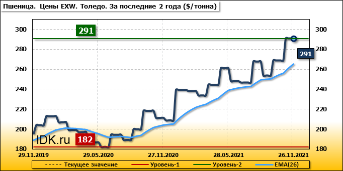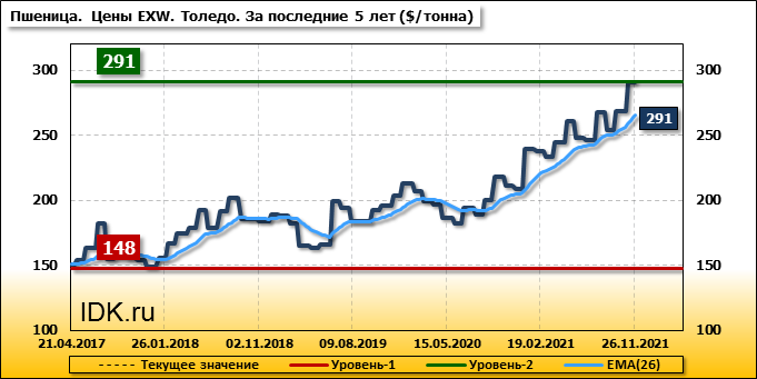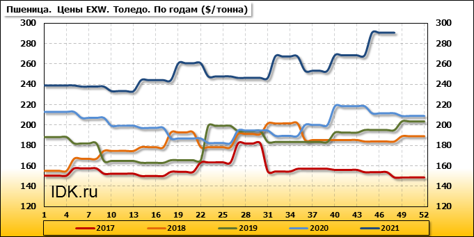Внутренние цены на пшеницу SRW в городе Толедо (США) выросли на 22.1 $/т. и на отчетный месяц составляют 290.72 доллара за тонну.