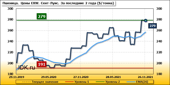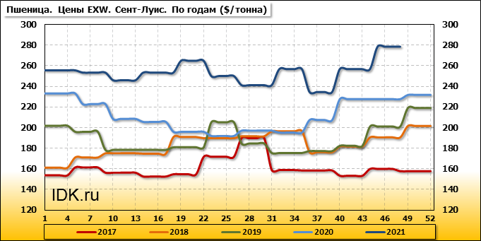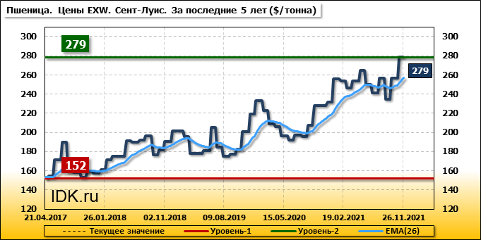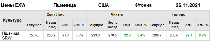За прошедший месяц внутренние цены на пшеницу SRW в Сент-Луисе (США) выросли на 21.7 $/т. и на отчетный месяц составляют 278.58 доллара за тонну.