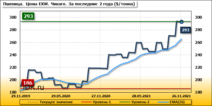В Чикаго (США) внутренние цены на пшеницу SRW выросли на 22.8 $/т. и на отчетный месяц составляют 293.3 доллара за тонну.